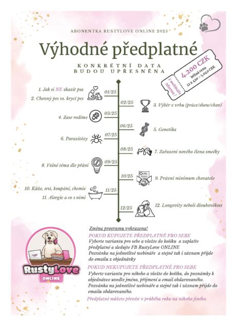 • Témata a data jsou zatím nevyplánovaná, ale na jaro rozhodně zařadíme něco z oblasti reprodukce a odchovu štěňat, také se v průběhu roku vrátíme ke genetice a novým nemocem a trendům z testování a z etických oblastí se mrkneme na následnou péči o nepovedené odchovy, řešení krizových situací s majiteli a právní zajištění. Na četné žádosti bude v roce 2025 zařazena oblast začleňování nového člena do smečky (nový partner, dítě v rodině, štěně do domácnosti s dalšími psy atd). Voucher bude uplatnitelný na jakýkoliv webinář pomocí slevového kódu ve výší 100% z ceny.